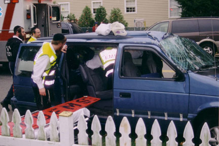 Hatzolah EMTs stabilizing the patient still stuck in the back of the minivan.