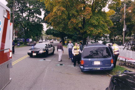 Hatzolah EMTs checking out the patients in the minivan. Passaic Police is blocking off the street.